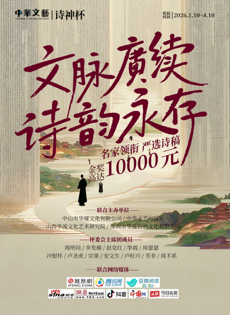 为传承三千年诗国传统,推动中国现代白话新诗创新发展,“中华文艺・诗神杯” 全国诗歌大赛于近日正式启动征稿。本次诗赛由中山市华厦文化有限公司、中华文艺出版社联合主办,山西华流文化艺术研究院、深圳市华夏百纳文化有限公司协办的 “中华文艺・诗神杯”,是 面向全国诗坛重要盛事。以高规格评委阵容、丰厚奖励机制及多元传播资源,为全国诗歌爱好者搭建展示才华的优质平台,征稿截止时间为 2026 年 4 月 10 日。